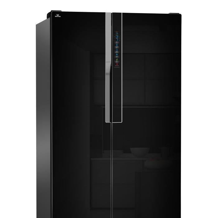 This is a high-capacity, premium Side-by-Side No-Frost refrigerator featuring MSO Inverter Technology. It offers massive storage space and is designed for high energy efficiency and silent performance. Built with eco-friendly Green Technology (100% CFC & HCFC free) using R600a refrigerant, it includes Electronic Temperature Control, Automatic Defrosting, and a sleek tempered glass door. The unit is designed to operate safely without a voltage stabilizer.