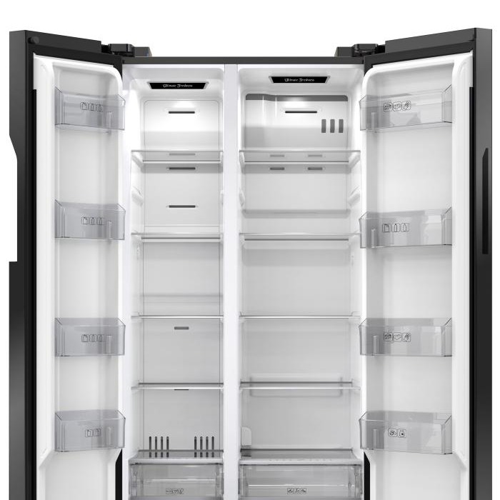 Type: No-Frost (Side-by-Side)Gross Volume: 563 Ltr. Net Volume: 501 Ltr. Compressor Type: BLDC Inverter Refrigerant: R600a Cooling Effect: Freezer Cabinet (-14°C to -24°C); Refrigerator Cabinet (1°C to 8°C) Temperature Control: Electronic Defrosting: Automatic Capillary: 100% Copper Shelves: 5 Glass Shelves in Refrigerator and 5 Glass Shelves in Freezer. Door Pockets: 4 GPPS Pockets in Refrigerator and 4 in Freezer. Interior Lighting: LED Lamp in both compartments. Dimensions (Net): 865mm (Width) x 725mm (Depth) x 1700mm (Height) Weight (Net): 103 ± 2 Kg Voltage Support: Designed to operate without a stabilizer.